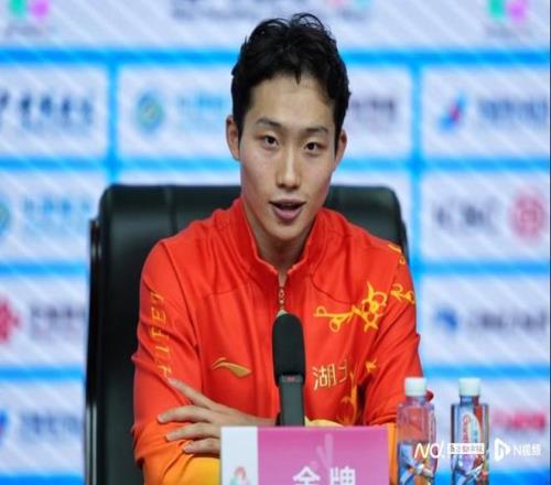 何超在赛后新闻发布会上。1992年出生的他是该项目所有参赛选手中年纪最大的,决赛中其他11位选手均是00后。